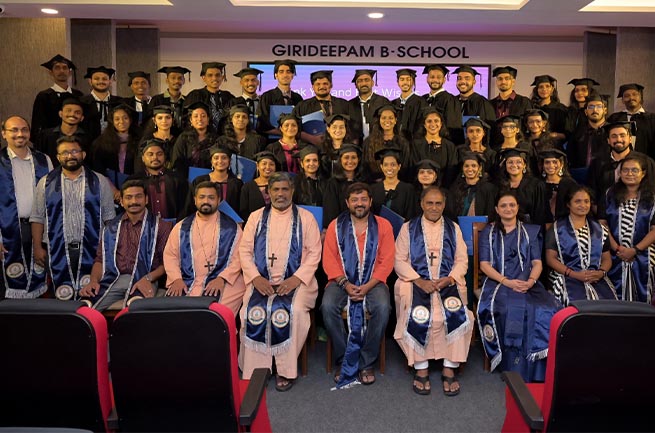 The 14th Convocation Ceremony of Girideepam Business School (GBS) for the MBA Batch 2023–25 was successfully conducted on 18 October 2025 at the GBS auditorium. The solemn event marked a significant milestone in the academic journey of the graduating students and was graced by eminent dignitaries, faculty members, parents, and students.