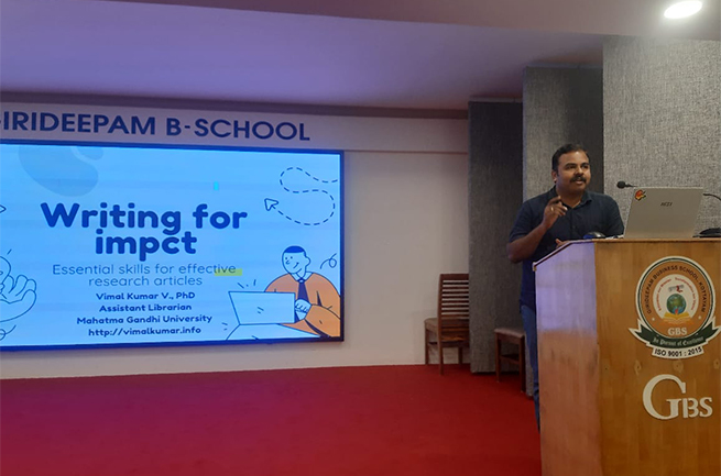 The NDLI Club of Girideepam Business School organized an Expert Talk on 'Writing for Impact: Essential Skills for Effective Research Articles' on November 5, 2025. The session was delivered by Dr. Vimal Kumar V, Assistant Librarian, M G University, Kottayam.